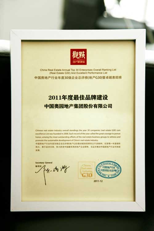 2011中國房地產(chǎn)行業(yè)年度30強企業(yè)評審會認為:奧園16年來致力復合地產(chǎn)開發(fā)理念的成功實踐,秉持“構筑低碳健康生活”的品牌發(fā)展理念,對健康住宅和低碳養(yǎng)生人居模式持續(xù)探索,在多個項目始終專注于倡導低碳、健康、養(yǎng)生的生活方式,做“康生活方式運營商”。新的發(fā)展理念和鮮明的項目特色不但讓奧園旗下的項目備受市場認可,亦使得集團的品牌價值日益提升。
