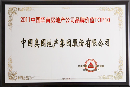中國奧園地產集團榮登2011中國華南房地產公司十大品牌價值TOP10