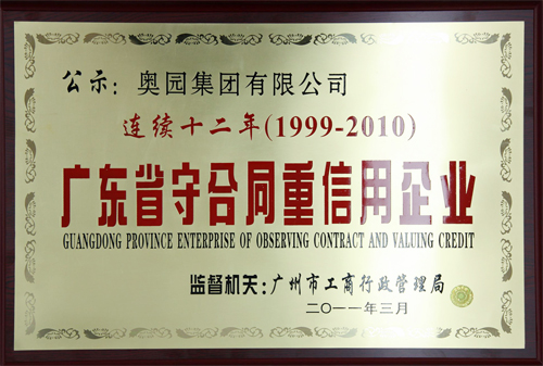 (2011年3月18日——廣州)中國奧園地產(chǎn)集團榮獲由廣州市工商行政管理局、廣州市合同管理協(xié)會公示頒發(fā)的連續(xù)十二年“廣東省守合同重信用”企業(yè)榮譽稱號。