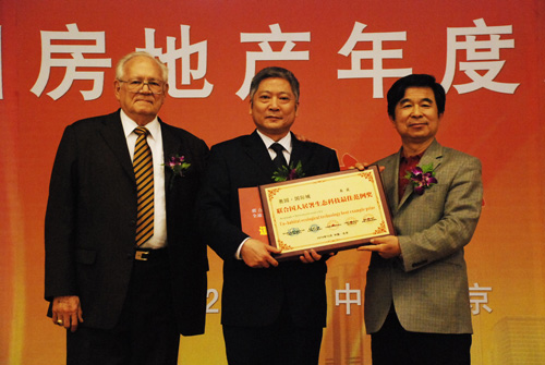 (2010年12月11日——沈陽)聯(lián)合國人居署全球最佳范例專家委員會副主任委員、北卡羅萊納大學政府管理學院經(jīng)濟學博士愛德華·思格魯格斯教授、聯(lián)合國工業(yè)發(fā)展組織中國投資于技術促進處綠色產(chǎn)業(yè)專家委員會委員、中國生態(tài)經(jīng)濟學會副會長、國務院突出貢獻津貼專家王松霈先生、中國房地產(chǎn)總評榜組委會秘書長王棟先生一行駛來到沈陽奧園·國際城,他們代表聯(lián)合國人居署全球最佳范例專家委員會和中國地產(chǎn)總評榜組委會向奧園·國際城頒發(fā)“聯(lián)合國人居署生態(tài)科技最佳范例獎”,奧園·國際城總經(jīng)理陶力群先生代表奧園接受兩位專家頒發(fā)的“聯(lián)合國人居署生態(tài)科技最佳范例獎”獎牌。