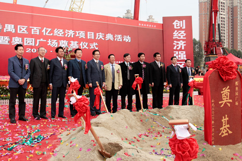 (2010年01月12日——廣州)2010年1月12日,大型綜合性商業(yè)中心奧園廣場(chǎng)工地上,彩旗招展,鑼鼓喧天,大紅拱門高高樹立,慶賀花籃擺放整齊,處處透露著喜慶的氛圍。作為“番禺區(qū)百億經(jīng)濟(jì)慶典活動(dòng)”分會(huì)場(chǎng),奧園廣場(chǎng)奠基盛典隆重舉行。番禺區(qū)領(lǐng)導(dǎo)歐康壽、戴永昌、龔漢坤、周志、夏紹國等和番禺區(qū)有關(guān)部門負(fù)責(zé)人,中國奧園地產(chǎn)集團(tuán)領(lǐng)導(dǎo)郭梓文、郭梓寧等以及施工單位、設(shè)計(jì)單位、金融機(jī)構(gòu)等合作伙伴的代表共200多人出席了此次盛會(huì)。