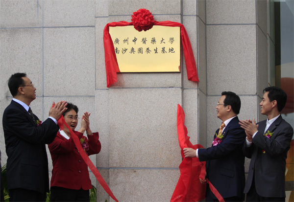 簽約儀式后,舉行了“廣州中醫(yī)藥大學(xué)南沙奧園養(yǎng)生基地”揭牌儀式,廣東省衛(wèi)生廳黨委書記黃小玲女士、廣州中醫(yī)藥大學(xué)校長徐志偉博士與廣州南沙經(jīng)濟(jì)技術(shù)開發(fā)區(qū)管委會副主任李自根先生、中國奧園地產(chǎn)集團(tuán)董事局主席郭梓文先生共同為牌匾揭牌。