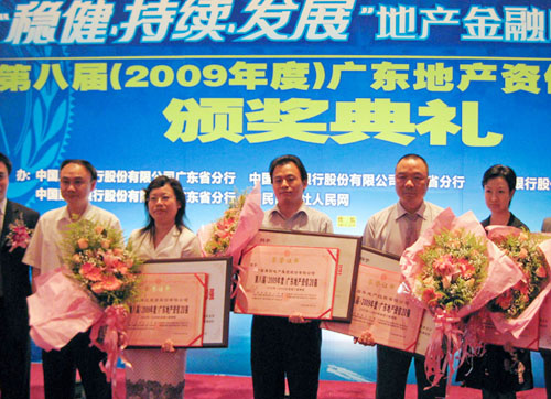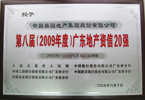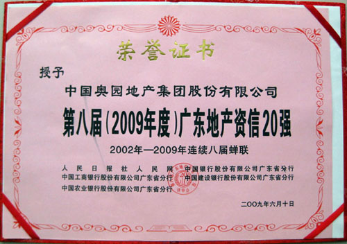 (2009年06月11日——廣州)中國(guó)奧園地產(chǎn)集團(tuán)股份有限公司(香港股票編號(hào):3883)榮獲由人民日?qǐng)?bào)社人民網(wǎng)、中國(guó)銀行股份有限公司廣東省分行、中國(guó)工商銀行股份有限公司廣東省分行、中國(guó)建設(shè)銀行股份有限公司廣東省分行、中國(guó)農(nóng)業(yè)銀行股份有限公司廣東省分行五大機(jī)構(gòu)共同頒發(fā)的“第八屆(2009年度)廣東地產(chǎn)資信20強(qiáng)”稱號(hào),成為連續(xù)八年蟬聯(lián)該項(xiàng)榮譽(yù)的四家大型房地產(chǎn)企業(yè)之一。